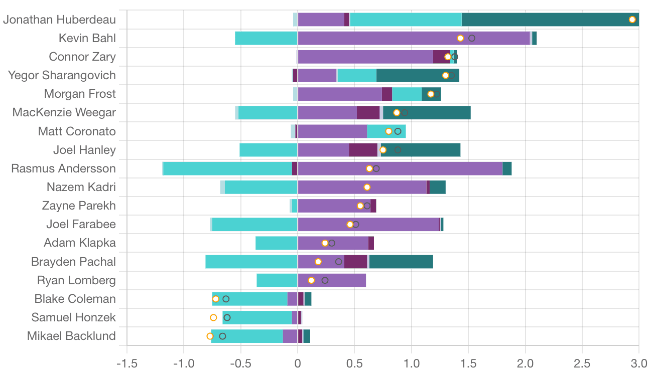 Taken By Chance – Once again Rasmus Andersson (70.65 SCF% // 69.50 HDCF%) and Kevin Bahl (73.78 per cent // 69.50 per cent) won the high danger chance battle – this game just a 2-1 advantage. I do not think it’s a stretch to say with the current record mixed with Andersson’s contract status he is a possible candidate to be traded. If he keeps up the play he’s had so far this season any team invested in advanced metrics will be quite interested. We already know when we watch him he looks the part of a top 4 defenceman, but this season he’s having a really good defensive bounce back compared to how last season ended