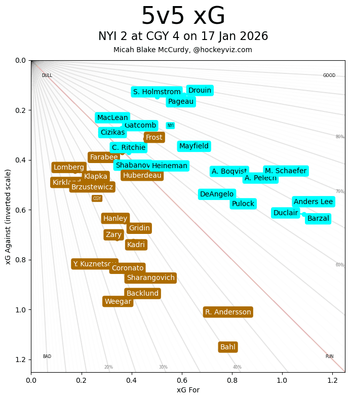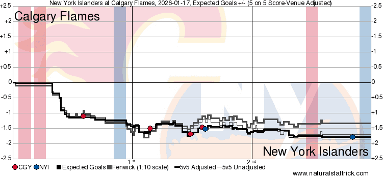 xGF% – Yegor Sharangovich (28.99 per cent) was another player who let ff one of those nice shots today. He’s at double digit goals on the season now and has been a decent depth scoring option for a couple of months. Not by any means a player in anybody’s long term top 6, but as a third line scorer he still has some appeal. Just another guy who I wish there was more out of him consistently, but I’ll take him finding any sort of groove for however long it lasts. He’s not going anywhere with his contract anytime soon. Other than that, it was pretty stagnant. Flames attack wasn’t anything to get the crowd excited, but their timely snipes were all that was required against David Rittich and the Islanders.