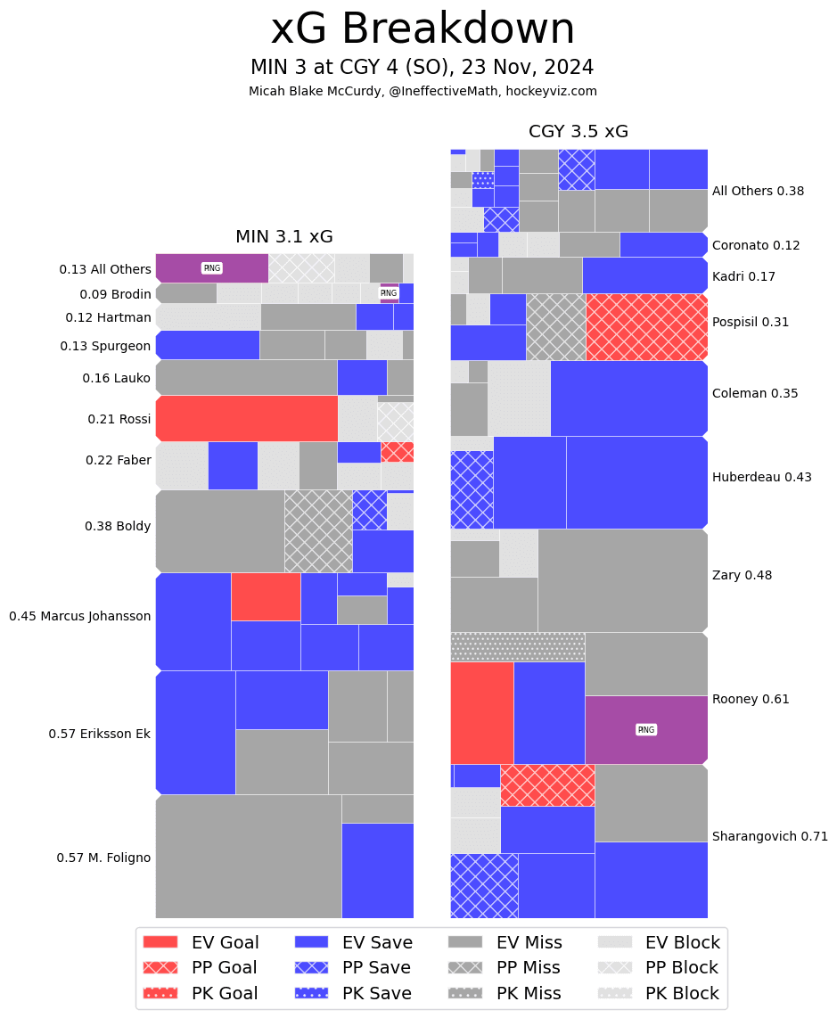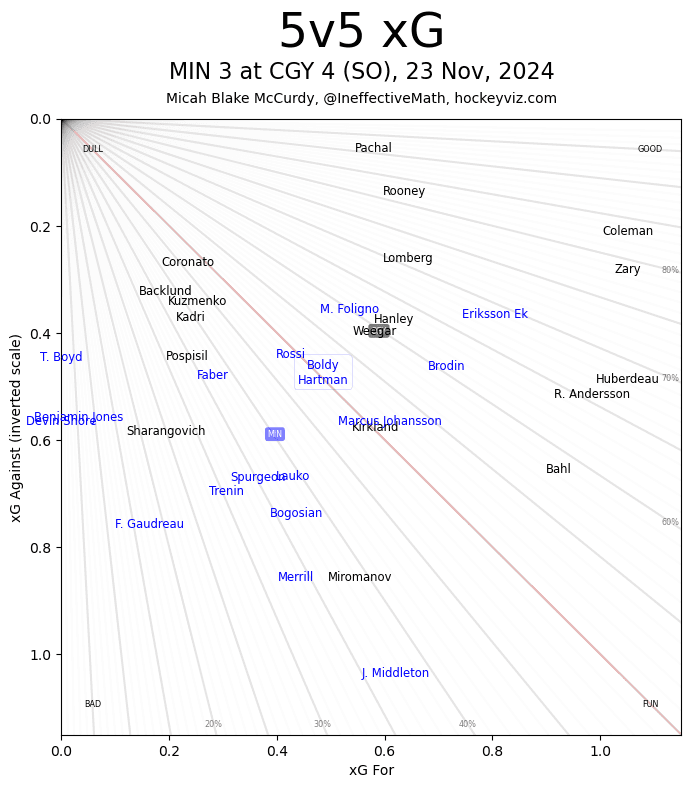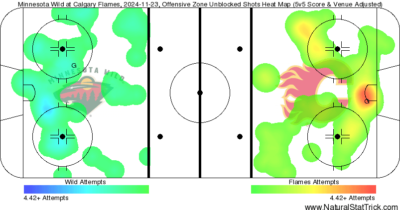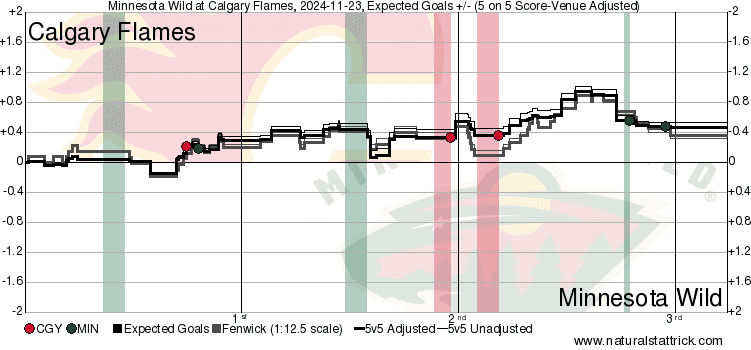 Taken By Chance – Rasmus Andersson (56.19 SCF% || 69.32 HDCF%) had to be kicking himself after a centering pass went right off a pair of skates to spring the Wild the other way on an odd man rush. They would score and tie the game – I’m sure nobody was more upset with that than Andersson himself. The rest of his night was classic Andersson getting involved In a lot of high danger chances while reaching a good quality share. One mistake is nothing to dwell on – especially if your team got the win. The Flames only 5v5 goal was a tip in by Kevin Rooney (74.49 per cent || 74.45 per cent) after a Daniil Miromanov (41.85 per cent || 26.49 per cent) shot. Rooney didn’t get too much ice time, but he did get another point-blank attempt in this one too. Made the most of his time.