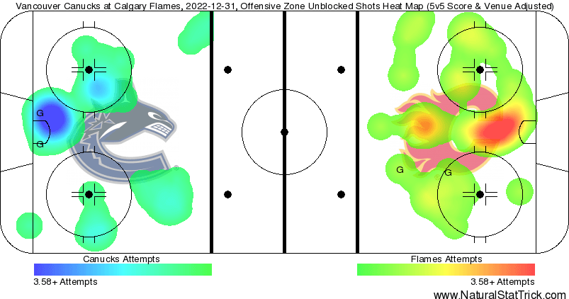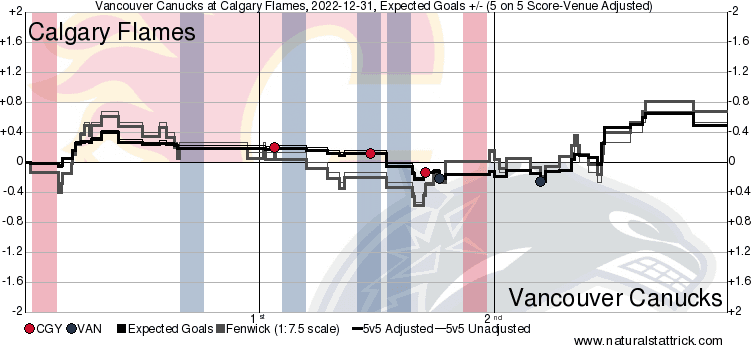 In The Crease – Markstrom’s athleticism was on full display as the Canucks tried to press for a tie. 1.43 expected goals against at 5v5 with both goals being high danger chances. The Dries goal was a bit unlucky for him with all those bounces. A solid performance from 25 giving everybody in the building a memory that will last forever.