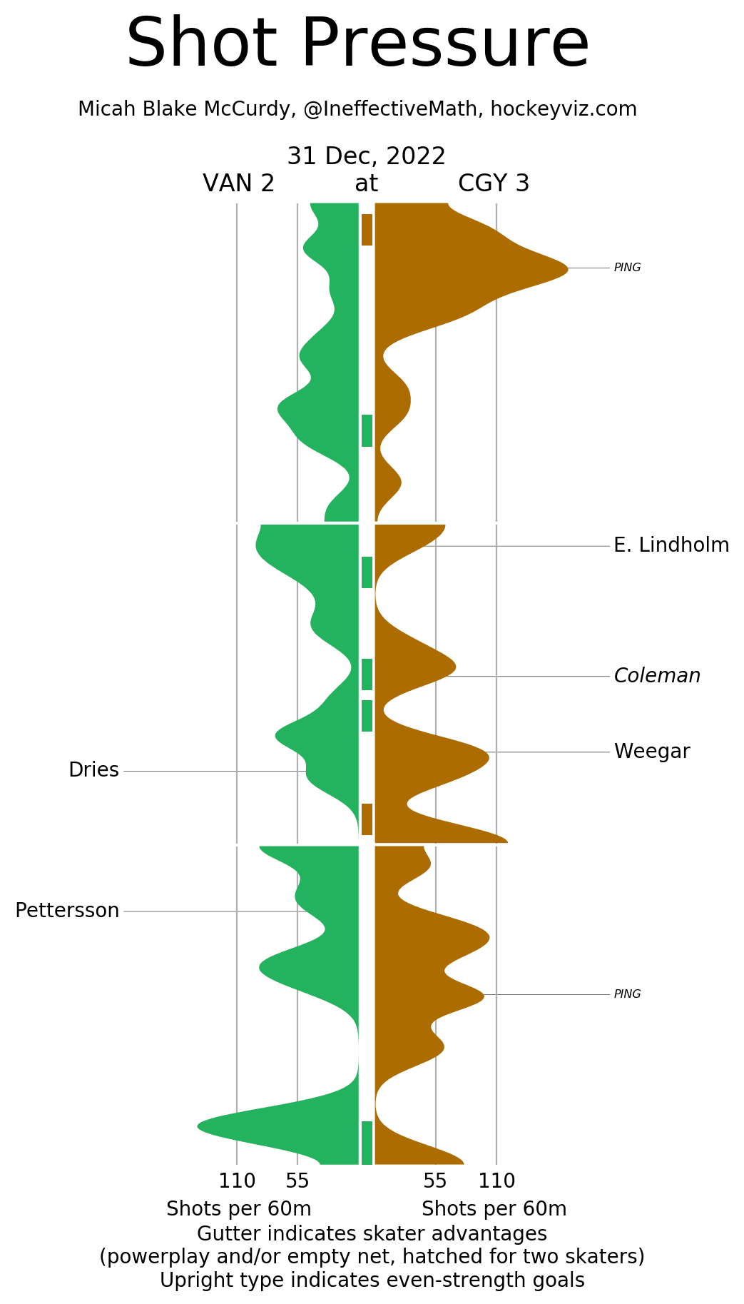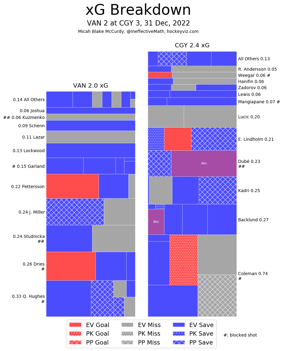 (Stats compiled from Naturalstattrick.com // Game Score from Hockeystatcards.com // xG and Under Pressure charts from HockeyViz.com // Game Flow and Shot Heatmap from NaturalStatTrick.com)