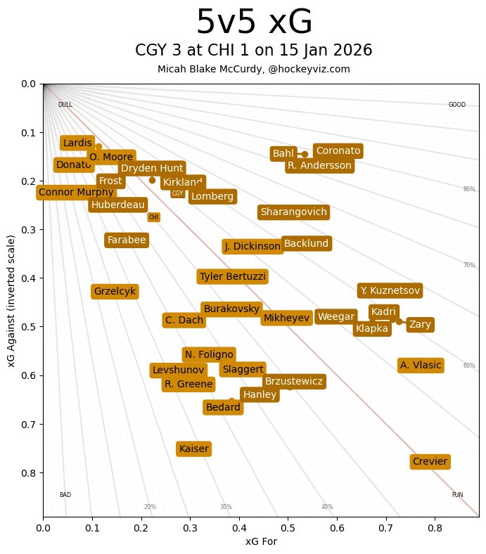 xGF% – What is the point of a fourth line if they are only going to play 5 minutes of hockey? Why are we giving a lineup spot to a veteran AHL player – who I have a lot of respect for – in the current state of things? Why can’t William Stromgren get into the lineup to showcase his skills more consistently? All things that come because the coach is still 100% fighting for the playoffs. No shot to Huska there, that’s the job and he keeps his eyes on the prize no matter what. I just disagree that these younger players hinder the lineup. They add an infusion of speed and energy this team needs most nights. Until Nazem Kadri (25.80 per cent) can figure out how to drive the bus again they need that kind of energy. Anyways, the xGoals fluctuated pretty heavy in this game because nobody gave up a ton or achieved a ton themselves. Fairly low event game which usually goes in the Flames favour.