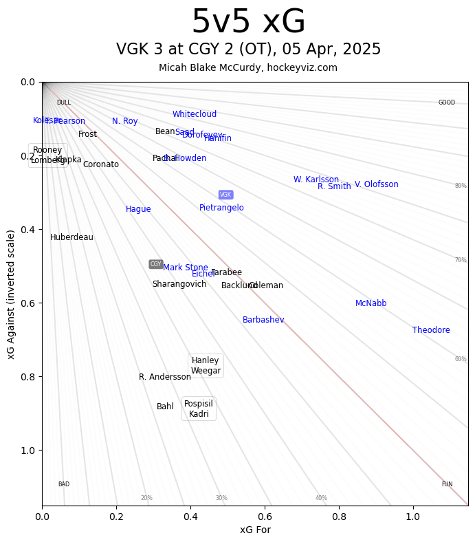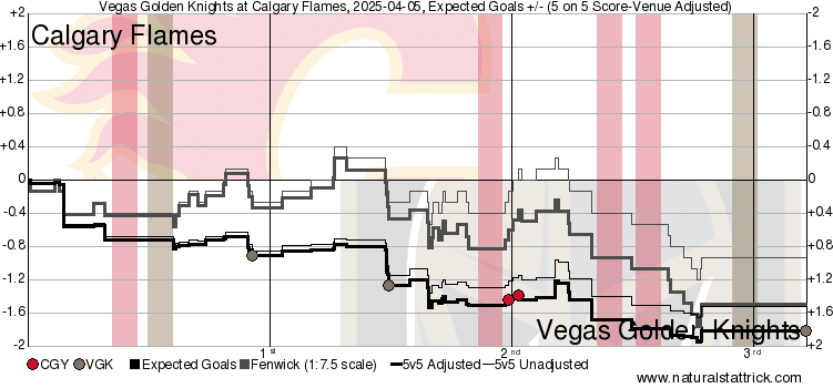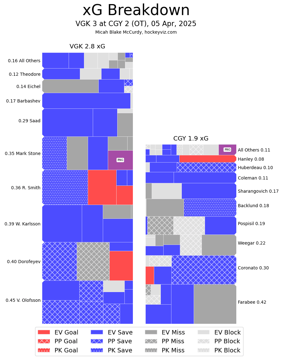 It’s a Team Game – Vegas is a very good hockey club and showed it frequently in this one. Calgary, who were fairly disciplined in their own zone, had a rough first period. High danger chances were 5-0 in favour of the Golden Knights – Calgary was struggling. After each period ends the Flames do have an ability to move on and refocus quickly. That happened as they put more pressure on Vegas, but still were giving up a lot in their own zone. Getting the first goal from Hanley to end the second period – followed by Coronato scoring early in the third – the Flames were able to shell-shock the Golden Knights. Things opened up significantly but the goaltending (mixed in with a few posts and crossbars) stood strong up until overtime. The unlucky end where the puck goes off Weegar’s skate and off Wolf’s back sure does stink, but the only thing anyone can do now is move forward. Six games to go – four points back of Minnesota.
