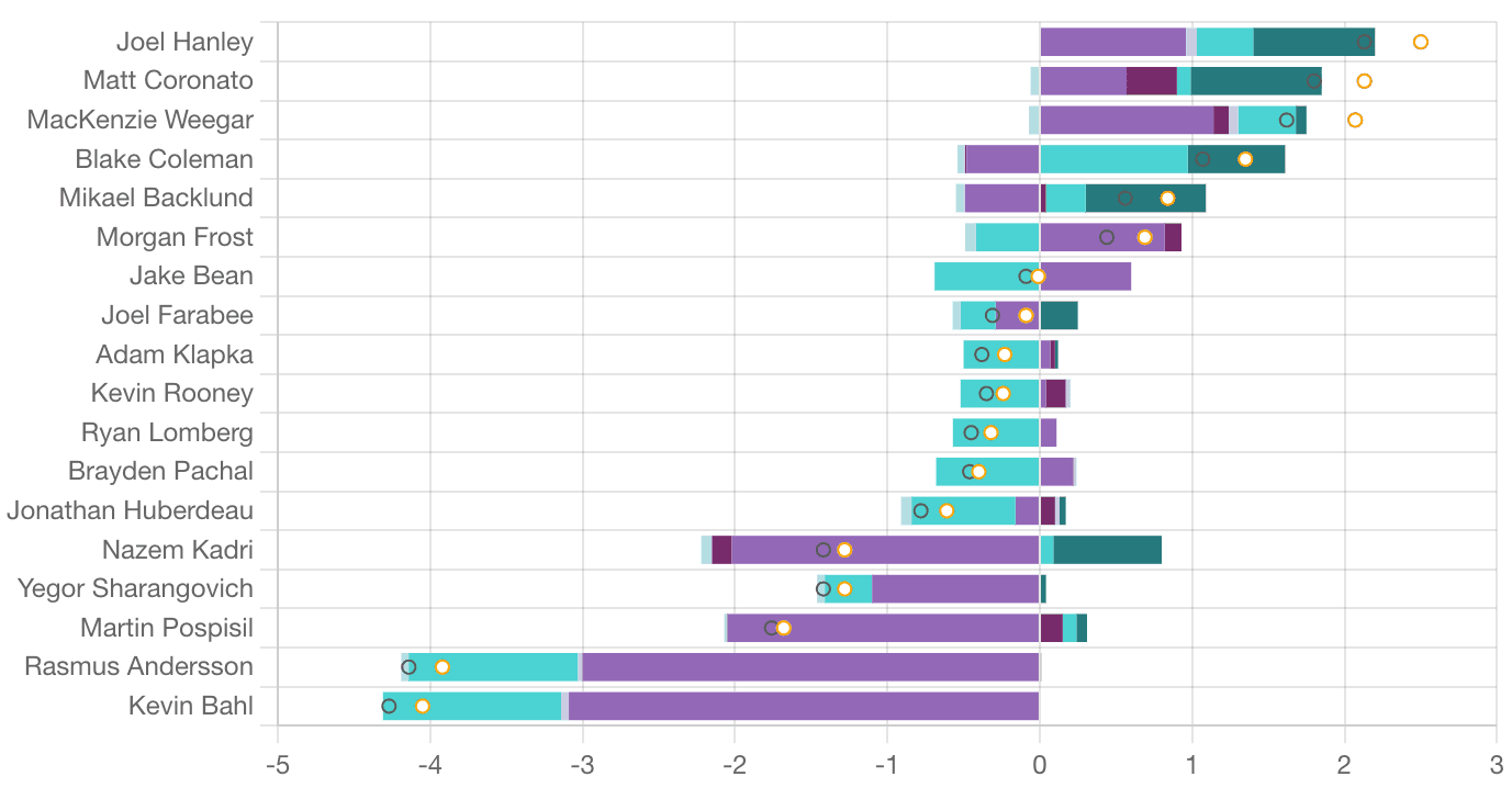 Taken By Chance – The two primary veterans had a rough go in terms of high danger chance disparity. I would like to point out that even though the first goal wasn’t classified as a high danger look, the pass Kadri (31.26 SCF% || 0 HDCF%) made was fantastic to set it up. Kadri and Huberdeau (31.26 per cent || 0 per cent) were both out for seven high danger chances against 5v5. A lot of quality looks were given up in their pursuit of offence – Dustin Wolf was more than up to the task of handling that added challenge – and it did eventually pay off. Calgary needs goals and it seems like only Kadri and Coronato (35.08 per cent || 44.93 per cent) can finish off anything consistently. Even then Coronato had been quiet for a week – hard to say anyone else (not named Kadri) have been more consistent of late though.
