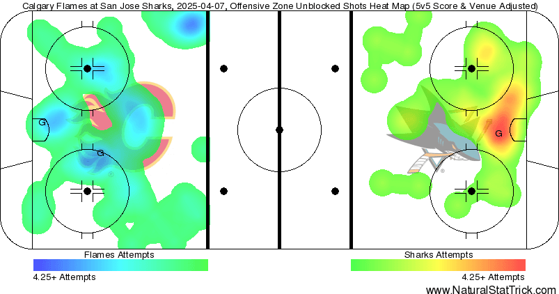 xGF% – Matt Coronato’s (39.34 per cent) third goal was one of the sexiest goals you could score. Driving the middle lane, he causes a direct turnover before sniping it past the unexpecting goaltender. It happened quick and was entirely created through his own individual efforts. It was rare in the sense the Flames don’t usually earn two goal leads. Especially late in the final period. They can get away with this stuff against a team of San Jose’s quality – trying this third period strategy against playoff teams is going to get themselves cooked.