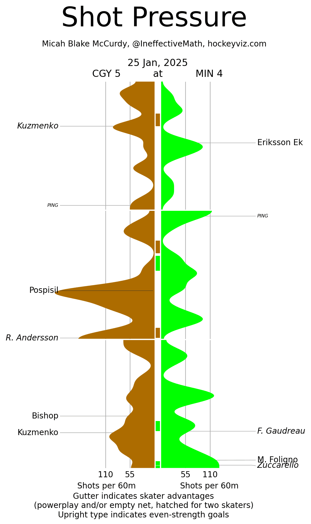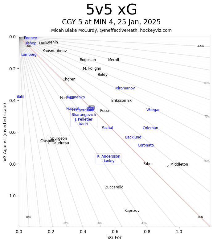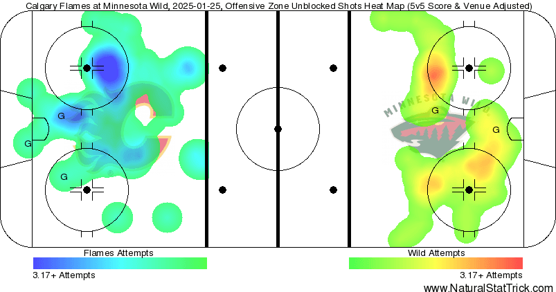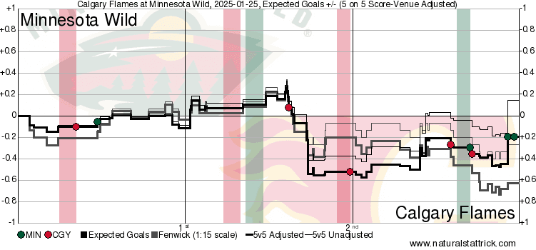 In The Crease – It’s a very rare night for Dustin Wolf where he let in more than the number of expected goals he faced at 5v5. It’s been weeks since the last time that happened. 1.78 goals against with just two getting behind him even up – as well as one power play goal and a 6-on-5 goal. He had things in control until late when the Wild really picked up things on their side. It’s hard to spend 50 minutes playing at one pace and then kicking things into a higher gear out of nowhere. Regardless that’s win number 18 for Dustin Wolf – here’s hoping he makes it to 30.