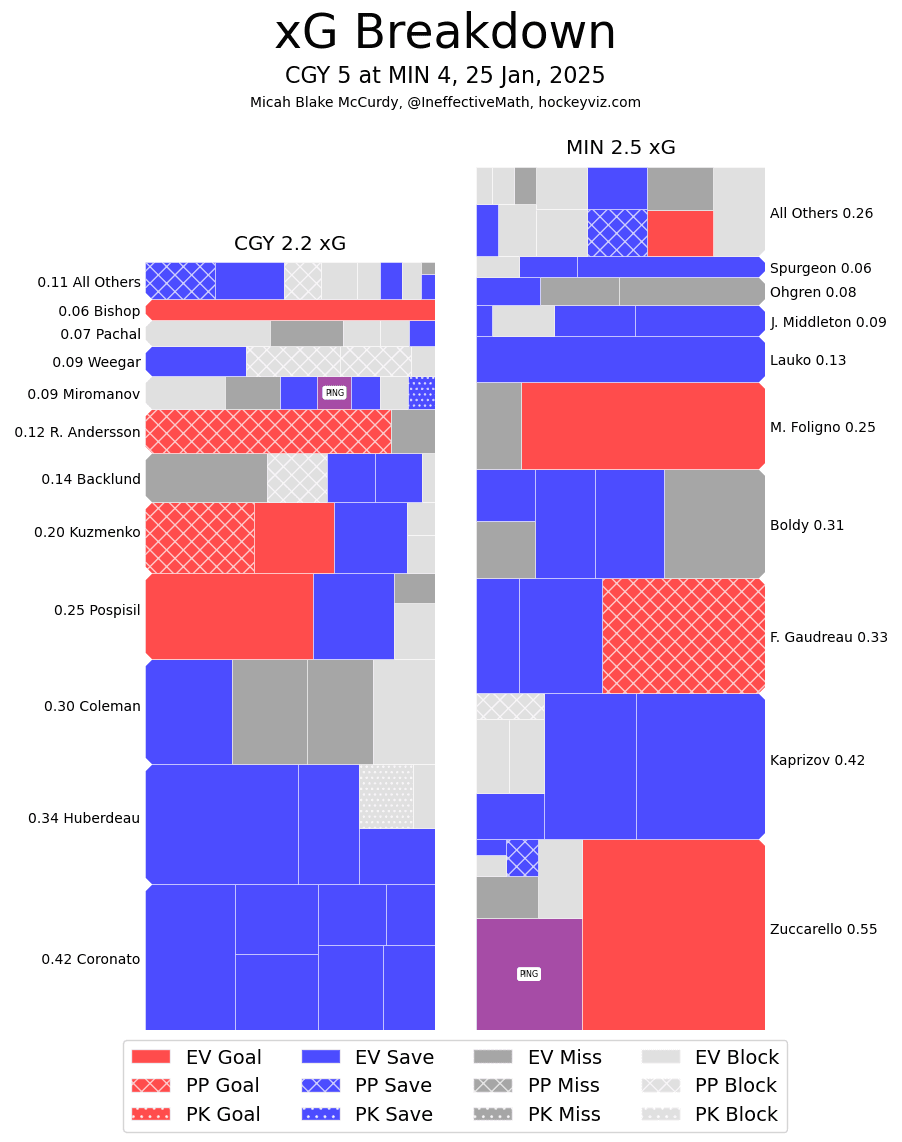 xGF% – Jonathan Huberdeau (59.84 per cent) and Nazem Kadri (54.59 per cent) may not have scored but they still produced a decent amount of offence. Pelletier (55.05 per cent) has been a nice fit next to them and it helps that Pospisil (38.65 per cent) also found success in this game with a goal and an assist on his new line. New lines sparked some more offence, exactly what Calgary needed. The Wild, in my opinion, were sleeping for a lot of the night – not playing anywhere near their top level as they are now in a slump losing 5 of 6. Marco Rossi led a bit of a comeback in the third, but Kuzmenko (46.47 per cent) finally came in clutch and put the Flames in the win column.
