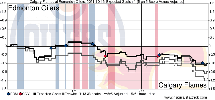 Look, no matter what team you are if you give Connor McDavid enough power plays it’s going to burn you. Two power play goals and one empty net goal for McDavid – nothing at 5v5. While you can’t count it as an actual win maybe we could call it a sentimental win. Those aren’t as nice, but from them we can see a lot of things that were executed well. The Flames had the majority of the 5v5 momentum, the just couldn’t get out of their own way.