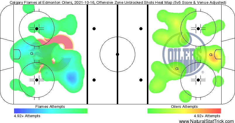 Flames clearly did a better job of shooting from the middle of the ice. The vacancy of chances from the high slot is a compliment to the defensive play of the Flames forwards. You don’t get a heatmap against you like that without a strong backcheck.