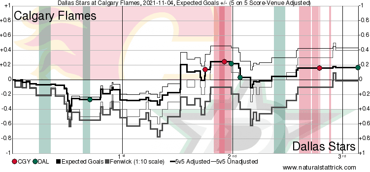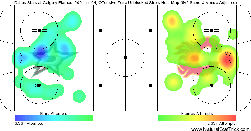 Calgary got in Khudobin’s crease quite heavily, mind you Dallas did the same to Markström albeit not quite to the same extent as the Flames. Calgary has done an exceptional job at getting shots from in tight – just need them to figure out how to constantly move the puck on the power play and they’d become the toughest team to outright beat in the league – well, the Pacific at least.