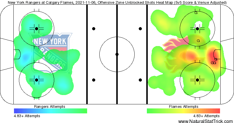 That’s at least nine games by my count where Calgary has made the opposing goaltender’s night hard. Consistently in the kitchen cooking with chances and – as we can see by the three G’s in the heavy red – paid off in spades. Do that against any opponent and you should find the W.
