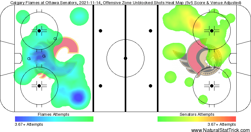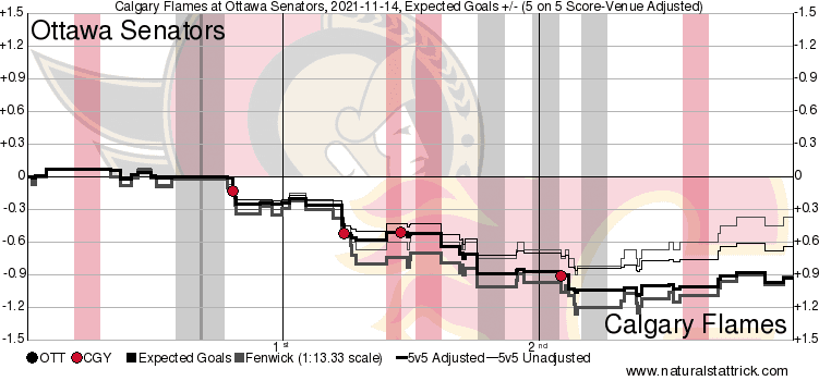 You can pinpoint the areas where Calgary applied severe pressure to the Sens and it’s great that it was rewarded in both instances with goals. Not immensely pretty goals, but well earned. Honestly though, a decent experience for a few young Senators to come up and experience some extended NHL action isn’t a bad thing for them. When they go back to the AHL (and most will) they’ll know what it takes to play at this level going forward – thanks to Calgary anyways.