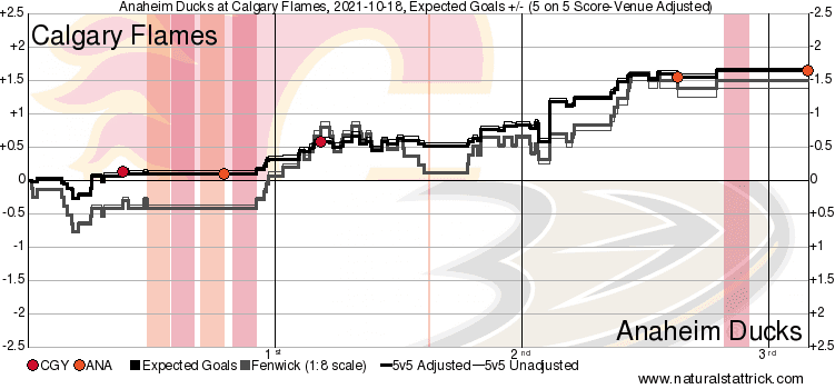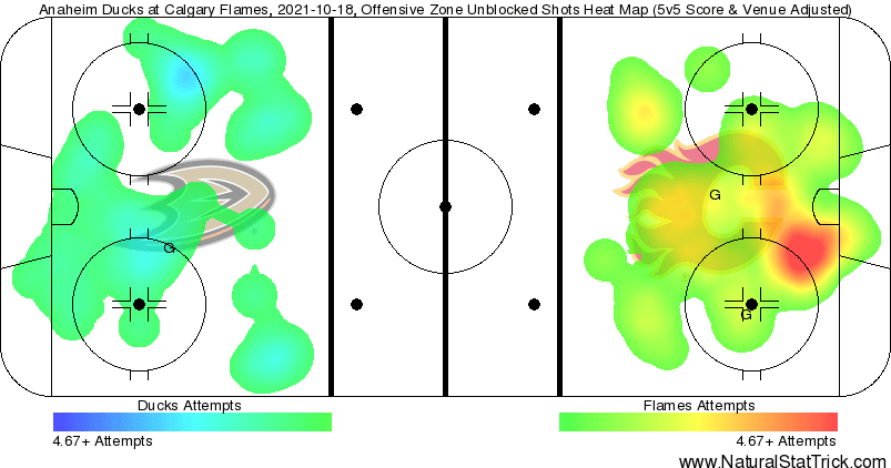 Heavy shots from in tight while the Ducks really didn’t get heavy chances from in tight. Two games in and Calgary is attacking the crease hard, maybe one day the puck will actually start bouncing their way. Not every bad team has John Gibson to bail them out.