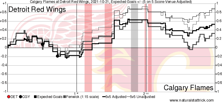 What a rollercoaster of a game. A real rough start that was not the Red Wings doing and more on the Flames failing to execute anything to success. It ended with a steep incline as the first was dominant. You can really see the negative impacts for Calgary came directly from post-PK. Pushed back in the third until around 5-7 minutes left and then cruised home by dumping the puck in deep and constantly clearing the zone.
