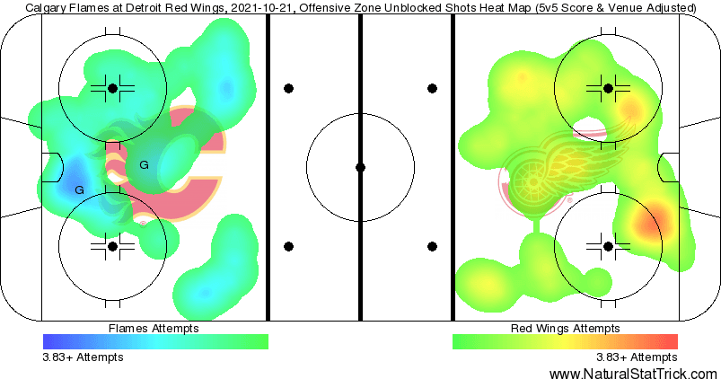 Look at the Red Wings chances from the slot out – minuscule. Now compare to the Flames – almost exclusively attacked the slot. This was a better game for Calgary than one would think given their rough 2nd period, but they ultimately ended up on top where they belonged.