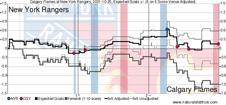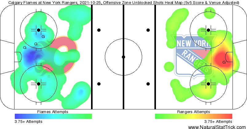 This is the first instance of a Flames goaltender being bombarded from in close at 5v5. The Flames overall had more attempts, but from the area that matters the Rangers held a clear advantage – despite the first and third being equal in opportunities. That statement adds onto what was another bad second on the road for the Flames.