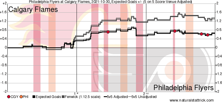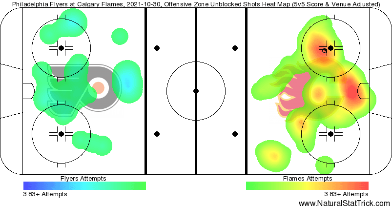 It’s a Team Game – It’s impressive to have one or two players finish a game above 60% expected goals – the team did that in this contest. The first two periods were a masterclass of possession-based hockey where the Flyers only generated nine shots on goal. The Flyers were also top five league-wide in goals coming into this one and they just generated nothing against a relentless Flames transition game. This is definitively a high point so far of this current win streak which now stands at six games.
