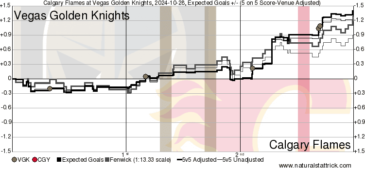It’s a Team Game – I thought the first period was fairly well played. Calgary was not making many mistakes, and the game was fairly even. Vegas did score in the first and followed it up with a quick pounce off a turnover early in the second period. This is the part where things get interesting. The second period had two things occur – the Flames did not register a shot on net in the first 15 minutes of the period and they out chanced Vegas in 5v5 high danger looks 2-0. Positives in that even though the Flames were being pressed into their own defensive zone they had at least made the middle of the ice hard to get to, but then they went and leaked six high danger chances against in the third period to counter that so everything averages out to match the overall result.