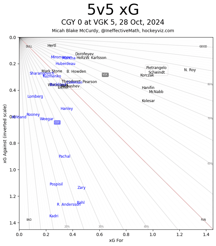 (Stats compiled from Naturalstattrick.com // Game Score from Hockeystatcards.com // xG and Under Pressure charts from HockeyViz.com // Game Flow and Shot Heatmap from NaturalStatTrick.com)