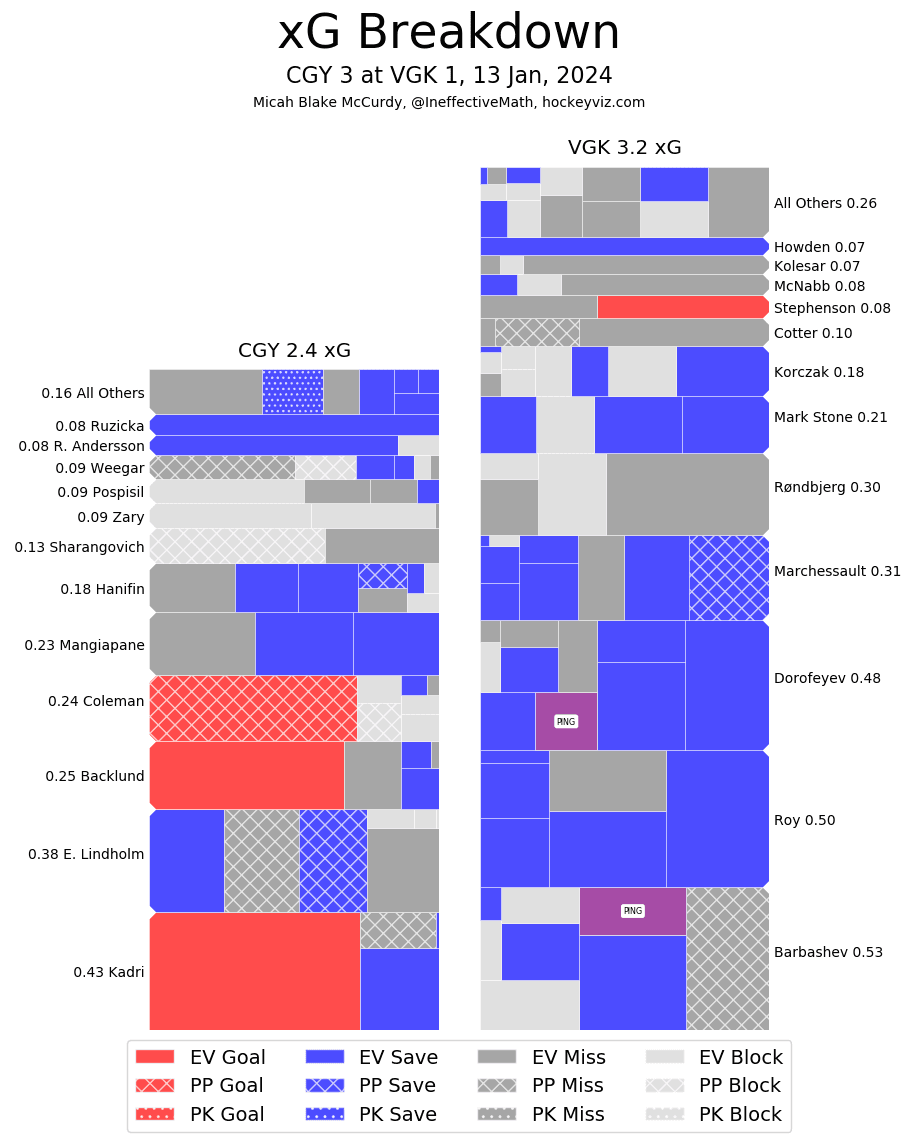 Corsi Clown – Out chanced over 2:1 on the game Ružička (27.37%) did not have himself a very flattering time. Dubé (33.47) and Greer (36.31%) also shared in the collective struggles. The defence all took a step up for Calgary as their lowest rated defenceman on the night turned out to be MacKenzie Weegar (43.63%). There were more people that finished in the 48-53% range than what is usually there.