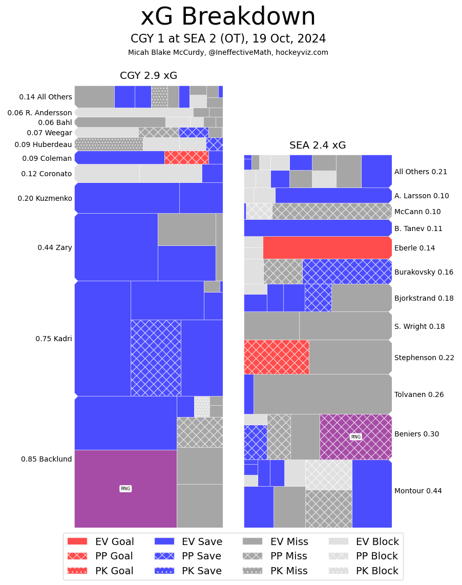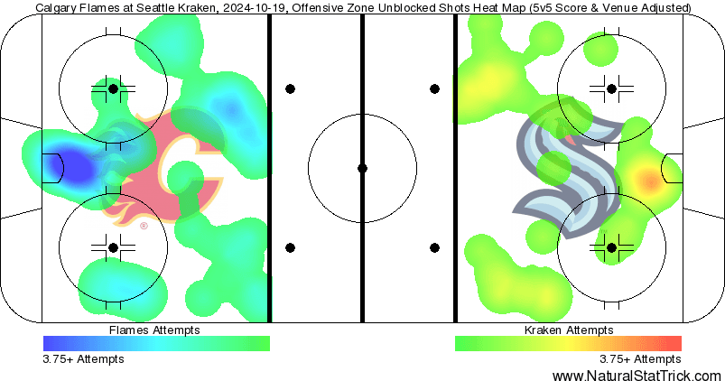 It’s a Team Game – I strongly believe the numbers here do not reflect the final result at all. The Kraken gained a lot of momentum every time they had a power play and Calgary kept making plays at the end of the game that baffled me. Mantha and Pospisil not being as hard on the forecheck as they have been all year, the defenceman constantly passing to nobody or trying to stretch it out through the neutral zone only to miss and get an icing, and the final play that caused the turnover in overtime. It all just ended up being a waste of a spectacular appearance by Dan Vladar – chaotic at times – but spectacular. Calgary’s 5v5 strength still drove them to a point and they do remain undefeated in regulation.