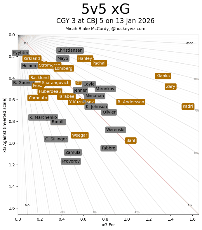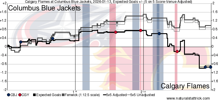 It’s a Team Game – Overall I do think this was one of the better overall games we’ve seen from the Flames in the year of 2026, their inability to turn those chances into tangible goals was a problem again. They were shutout at 5v5, scoring all 3 goals on the powerplay. I’m happy about that – the Flames were 32nd of 32 in terms of percentage coming into the game – so seeing them score a bunch was a welcome sight. It’s all for nothing though because they couldn’t find another one at 5v5. There’s not much of a counter strategy if their normally good defence falters due to bad bounces or worse turnovers. They were 94 seconds from collecting a point in the third – their best period of the night, too – before MacKenzie Weegar coughed up the puck allowing Boone Jenner to snipe home the game winner. Even on the good nights of late the Flames end up on the wrong side of the results, a trend that could become the new normal going forward if the Flames sell off some pieces pre-deadline.