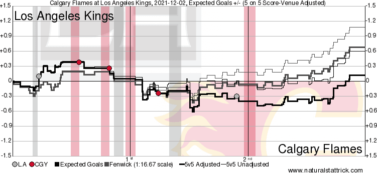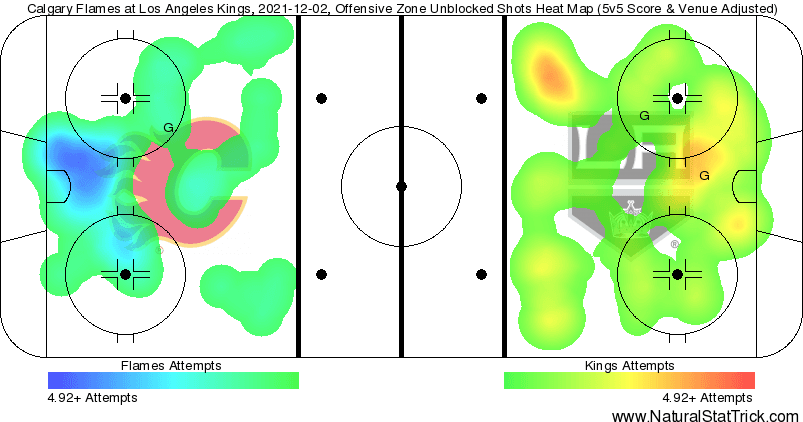 A true bounce back affair when it comes to momentum. Shared in the first, taken by Calgary in the second, and grabbed back by the Kings in the third (really snagged it late). The sheer volume of chances LA got would naturally have them swarm their xG total so this is a bit misleading. When you get to the heatmap we’ll show just why Calgary was never in as much danger as it appeared.