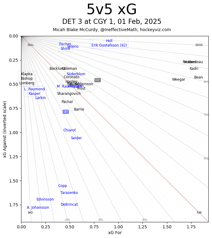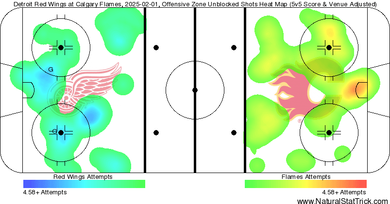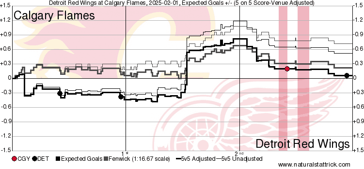 In The Crease – Even in a loss Wolf finds a way to put on a display. He made spectacular stops off Larkin and Soderblom late and was ready off of every single turnover and set on every single odd-man rush. Craig Conroy at intermission was asked by Kevin Bieksa if he felt Wolf could be the Flames next Kiprusoff. Conroy said he’s very close – Wolf’s numbers do a lot of the speaking for him. All Wolf seems to be focused on is the next period he’s got to play and all the pucks he’s got to stop. 1.88 expected goals against at 5v5 with two goals getting behind him.
