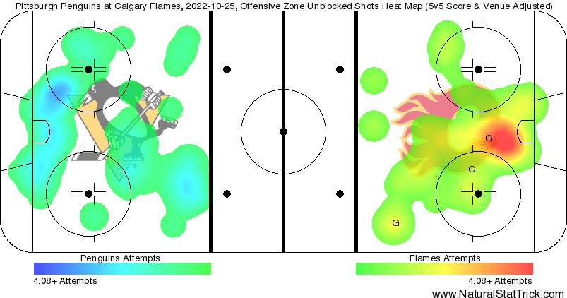 Funny Pittsburgh got all of their dangerous attempts from exactly where the heatmap from the Betway article said they would. Like they are useful tools to use to help pre-scout and predict what the opponent is going to try and do. Hard to pre-scout against the Flames just swarming your goaltender but teams can sure try.