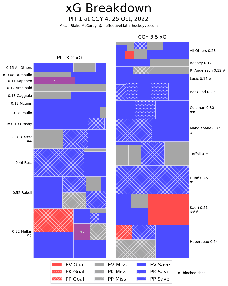 It’s a Team Game – This new look Flames team has been strong at closing out third periods – a very big reason for their exemplary record of 5-1-0. 76.34% of the high danger chances in the third period (5v5) when the Penguins needed three goals is exactly what you want to see from a team that hopes to make the playoffs. Doing it against the all-world Penguins trio of legends – who’ve been lighting up their opposition so far this year – I’ll take that 12 times out of 10.