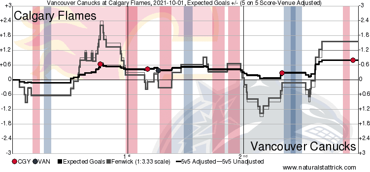 In The Crease – He wasn’t that busy at 5v5 (just 4 shots faced in 14:27), but Dustin Wolf looked agile and very reactionary. 2 high danger chances in one period worth of ice time. Markstrom was good too. Team played so good in front of both goalies they hardly were tested to too much of an extent. The goal Markstrom allowed wasn’t a fluffer, it came from the dangerous area of the ice. If you’re going to get beat that’s the area it’s acceptable from.
