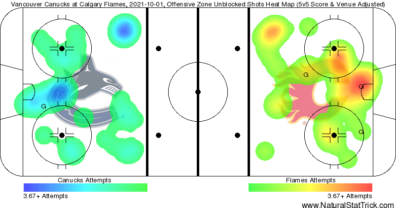 The Canucks were able to get to the slot a fair bit, but a very minimal amount in close to the crease. The Flames on the other-hand surrounded Demko like a pack of hungry piranhas. Johnny’s goal off to the side their wont get the classification of how dangerous his chance really was. Nifty passing by Tkachuk and especially Lindholm to thread the needle across traffic right to Johnny.