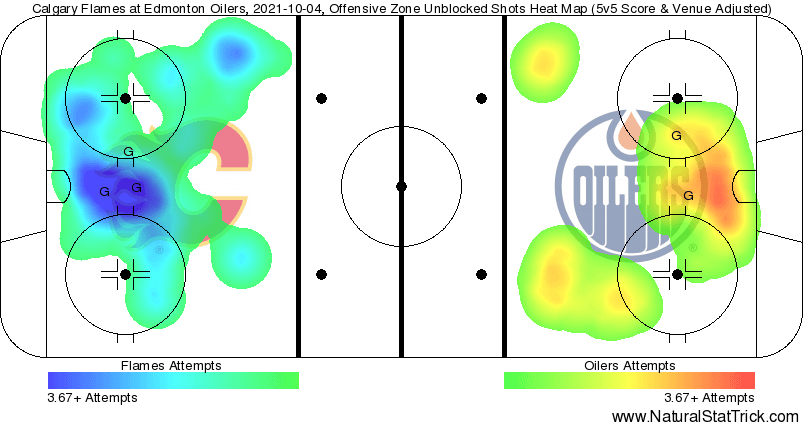 Taken By Chance – All the scoring chances for the second full game in a row Johnny Gaudreau (100% SCF% // 100% HDCF%) was flying out there. Flames fans are nervously holding their breath as they wait to hear why Johnny Gaudreau missed the third period – the team said it was for precautionary reasons. Interesting case for Dillon Dube tonight. When dubs was on the ice 76.98% of the 5v5 scoring chances were towards the Oilers net, that’s a fantastic number, but… none of the chances he created were classified as “high danger.” So he clearly was creating chances, but failed to create something significant.