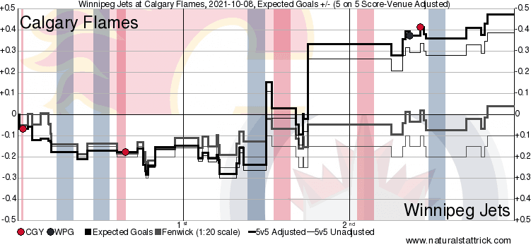 It’s a Team Game – Like we said the Flames got off to a “slow start”. Yes they knocked the two power play goals in early which is what’s needed to win, but at 5v5 the first period was all Jets… sort of. The Jets dominated possession, total scoring chances, and even expected goals – but no one of them were classified as high danger. The Flames shut play down in front of their own net tonight and made the Jets shoot from distance – making Markstrom’s night easier.