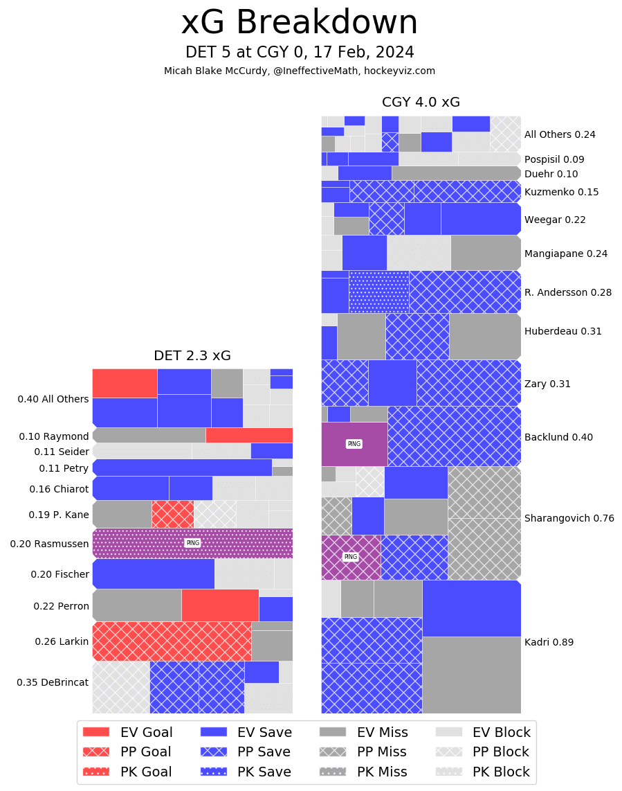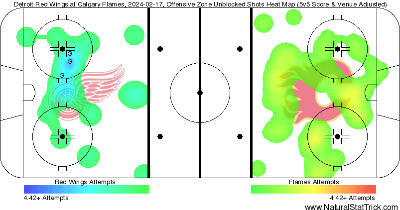 It’s a Team Game – In all honesty one would normally look at those ratios, then the score, before doubling back confused as to how it was 5-0. From those that watched it was clear when the Red Wings got a serious opportunity there was a lack of effort to defend. For the most part the Flames stuck to a decent gameplan that would net some goals, but the amount of high danger looks was quite minuscule. After the score appeared out of reach for a Flames team that tries to win games 3-2 the overall dangerous level of the game subsided. The last 20 minutes turned out to be a better cardio session for all involved than an actual game of hockey.