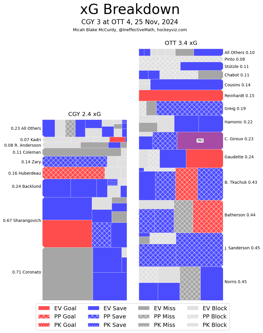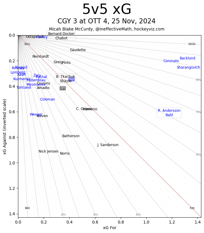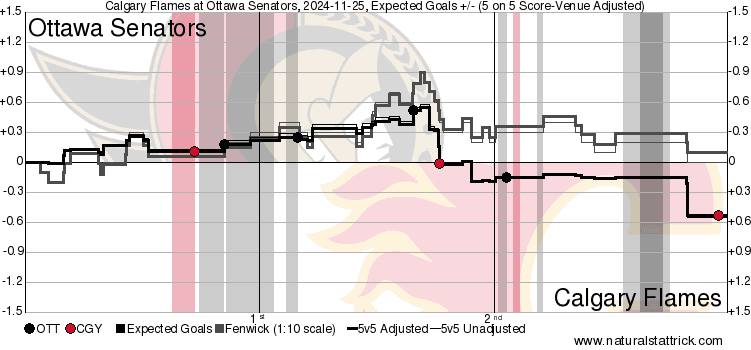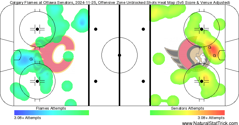 In The Crease – The Dustin Wolf show didn’t get the win and let in some goals we didn’t see happen at home. That’s okay – the team in front of him did a pretty bad job of limiting the Senators forwards in front of him. Power play goals with defenders leaving positions and not enough time to get over there. With how the season has been operating after a performance like this I expect a shift back to Vladar in Detroit. No worries – just an off night. 1.04 expected goals against with 2 getting behind him at 5v5.