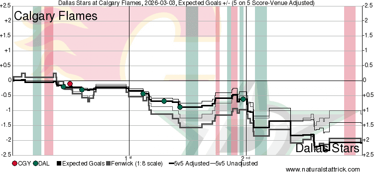 It’s a Team Game – From the moment the puck was dropped the Dallas Stars looked like the better team. Possession of the puck, scoring chances, and shot attempts all ended with a massive advantage for Dallas. High danger scoring chances were 20-6 in favour of the visitors as well. It is very rare for the Flames to surrender that much to their opponent, but as the team sheds pieces the more experienced teams should be the ones to take advantage. It was a rough night to be a Flames fan at the ‘dome, not a lot went their way.