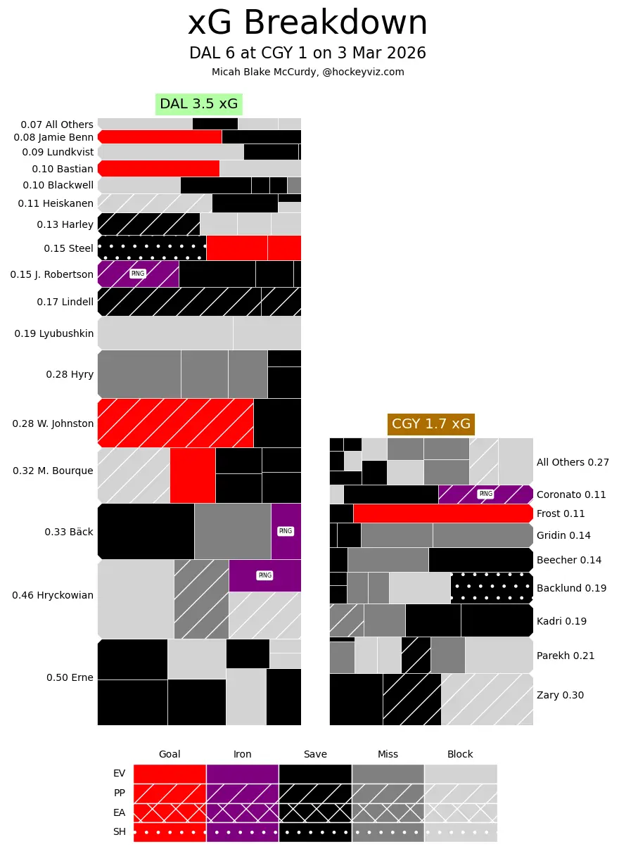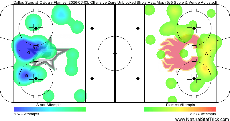 Corsi King – Zayne Parekh (46.98%) finished with the best results of any Flames player. The Stars got a few goals off some lucky bounces, but Parekh only ever happened to be out for a single goal against. He was also over the boards when Morgan Frost (35.63 per cent) scored his google giving him an even rating on the day. In a 6-1 loss, that’s quite noticeable. In terms of shot attempts nobody finished with a greater than 50% ratio. Over 80% of the team was below 40% – just very one-sided.