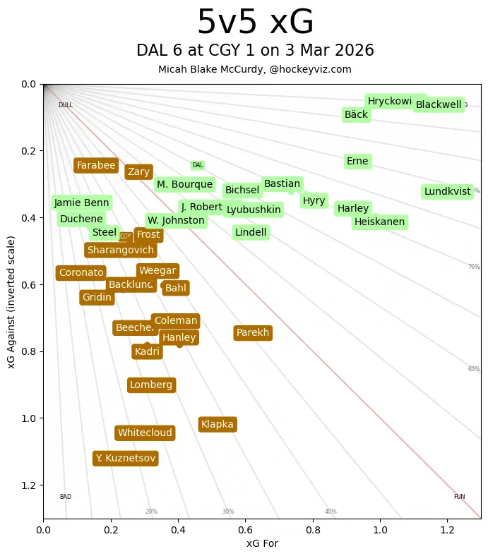 The Dallas Stars came to town, showed Calgary who was in charge, and left, defeating the Flames by a 6-1 score.