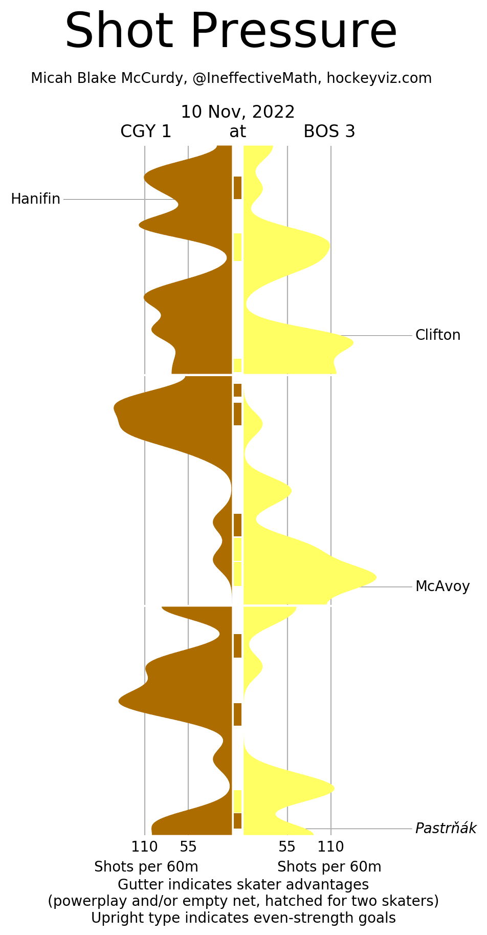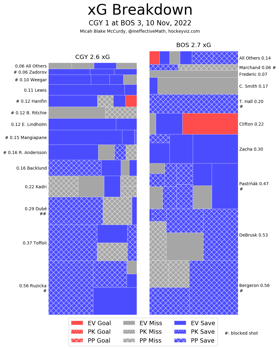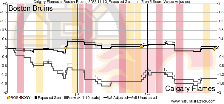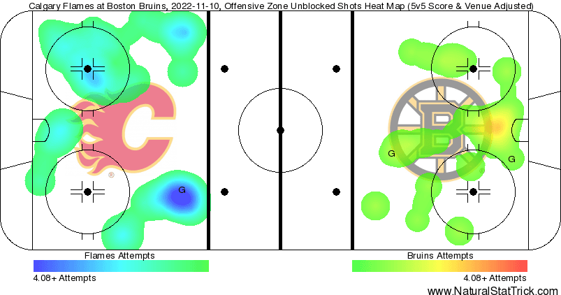 It’s a Team Game – The Flames didn’t dominate this game; they just had the puck more. The dangerous chances and overall quality at 5v5 were both within rounding range of 50. While the first three goals all register as 5v5 both Hanifin and McAvoy’s goals came directly at the end of power plays. Just the first Bruins goal was the only instance a goaltender truly got beat 5v5. A defensive battle of a game that was physical and entertaining.