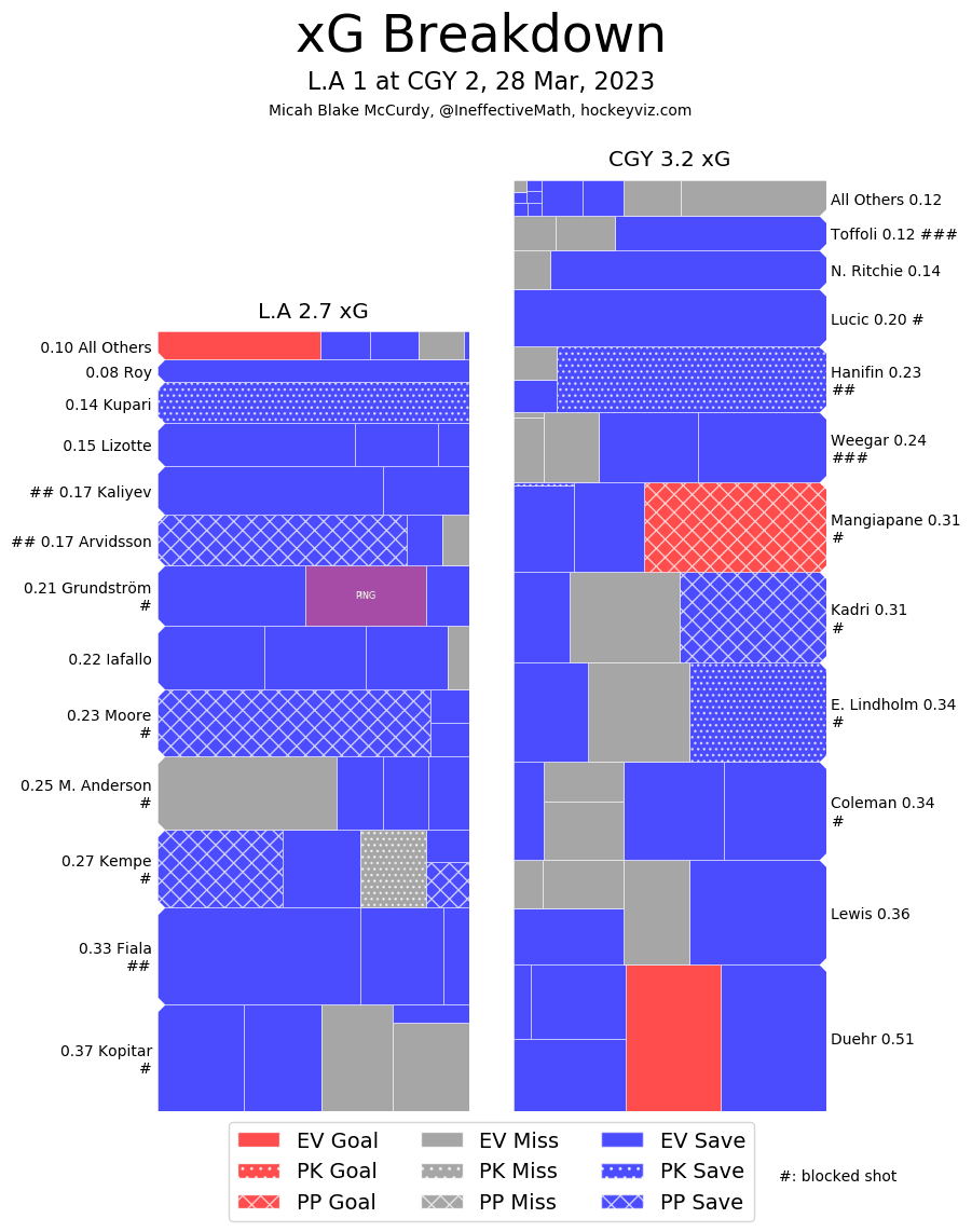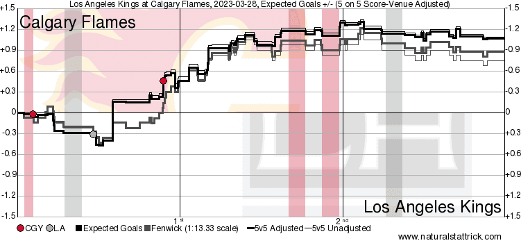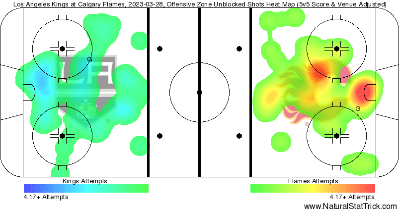 xGF% – Trevor Lewis (75.40%) had a quality game. I harp on him a lot when he falters so I would like to raise him up when he succeeds. I’ve really loved his offensive touch in front of the Flames net lately. It hasn’t translated into a high amount of goals but it’s got him a few extra points the last month. A few Flames were in the dumps like Mikael Backlund (38.48%), Nick Ritchie (38.15%), and Stecher (20.80%).