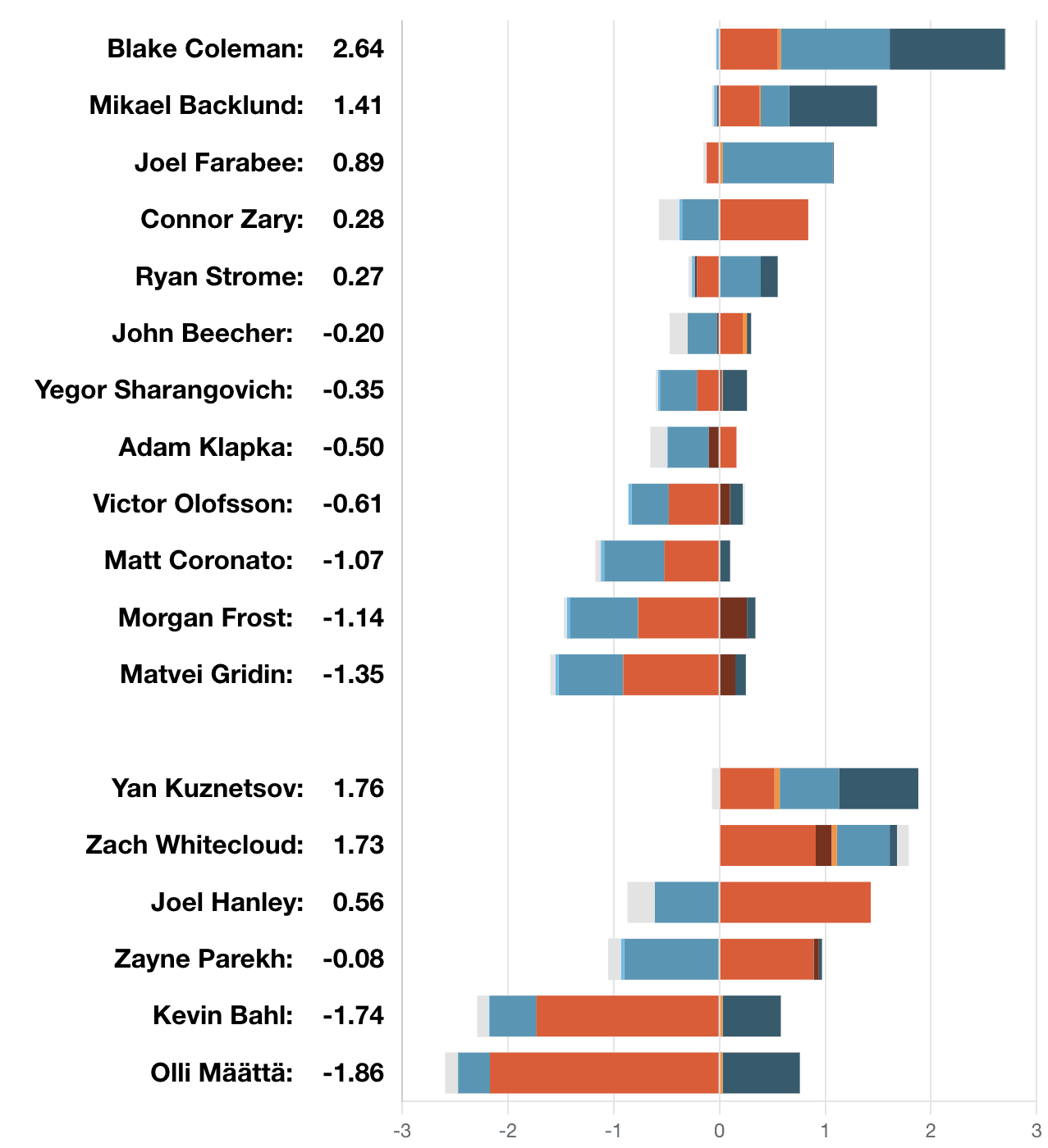 Corsi King – Connor Zary (87.74 per cent) at the top despite limited minutes. It’s more important for who right now to get opportunities? Right the pending UFA wingers that are brand new, such as Victor Olofsson (37.97%). It’s cool to go in the rebuild direction so long as everyone goes in the same direction – I think there may be a disconnect with the coach a little bit. Not completely – he still plays Matvei Gridin (30.69 per cent) regularly – but he can certainly find some more ice time for Zary as well as playing both Hunter Brzustewicz and Zayne Parekh (35.66 per cent) in the same game. Just a more specific eye on the future, it can be better in that area.