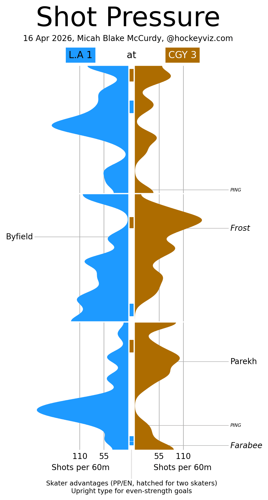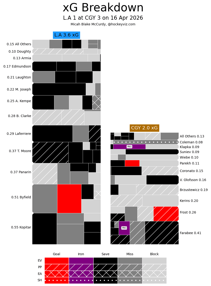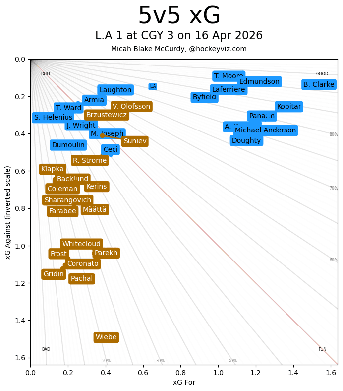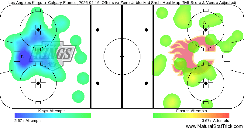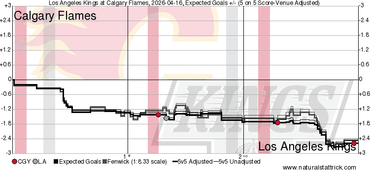 Corsi King – Victor Olofsson (58.27 CF%) played the least amount of 5v5 in this game, with Aydar Suniev (51.94 per cent) just behind him. Calgary leaned fairly heavily on the Mikael Backlund (36.31 per cent) and the Morgan Frost (29.87 per cent) lines. The Kings were really pressing hard to start the game, likely due to the fact they still had a shot at moving out of a wild card and avoiding the Avalanche (cue the Darryl Sutter quote). By the third period the Ducks had won and the Oilers had a massive lead, locking them into that fight, and it was then that the Flames were finally able to get some decent counter opportunities.