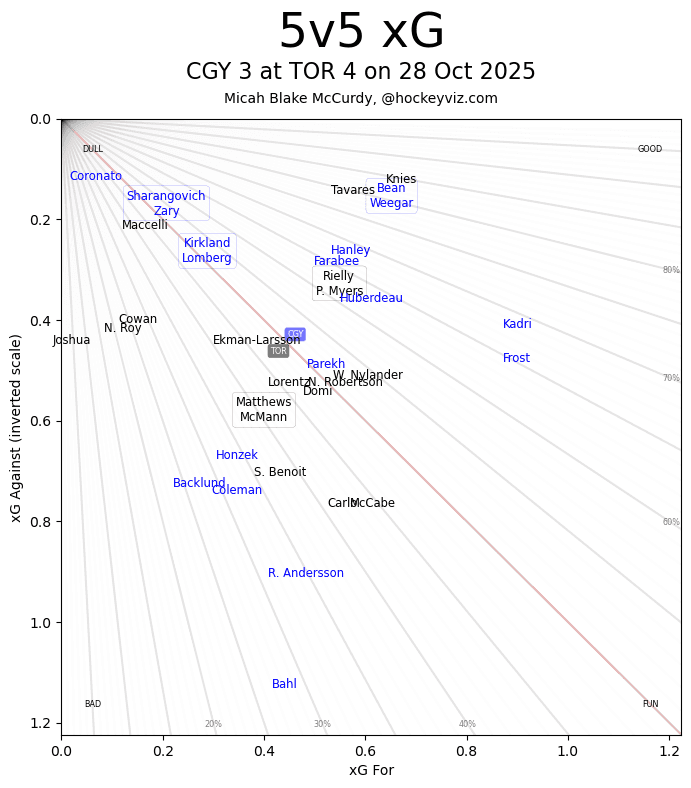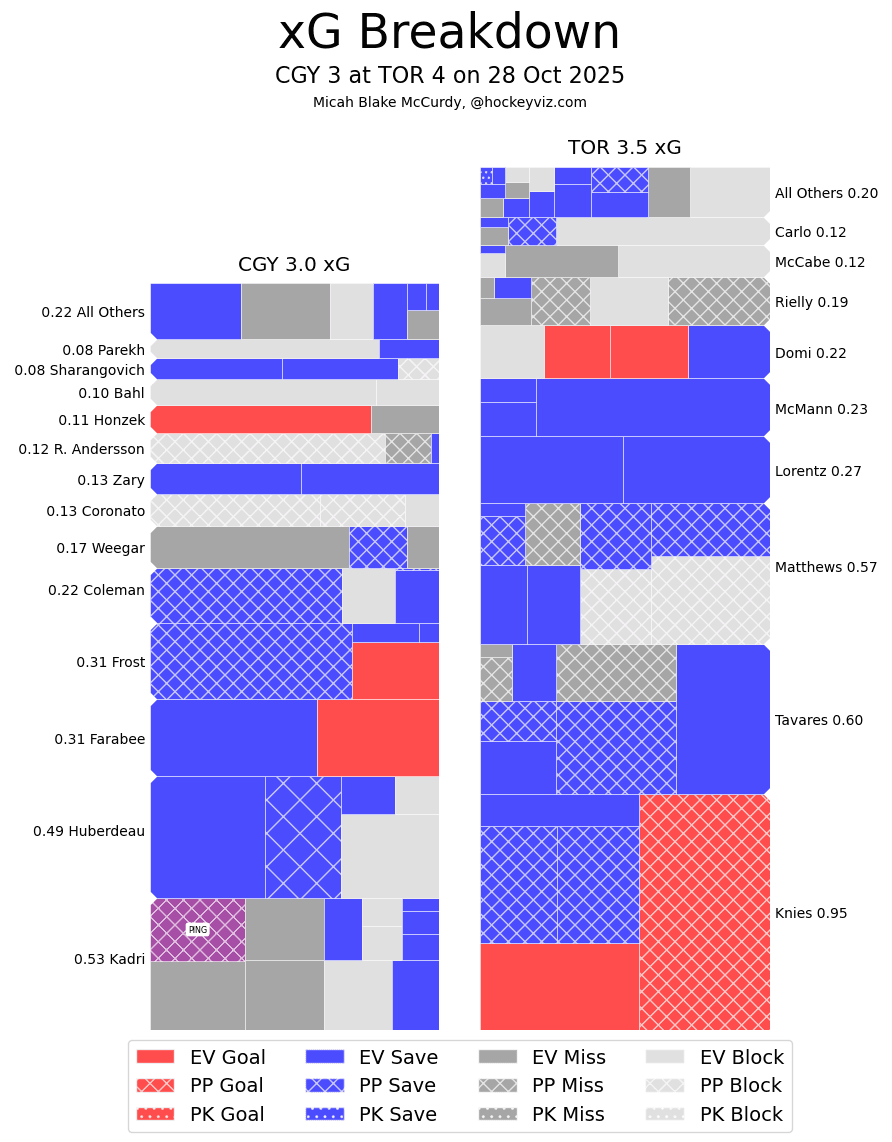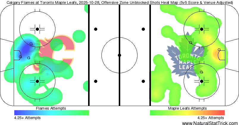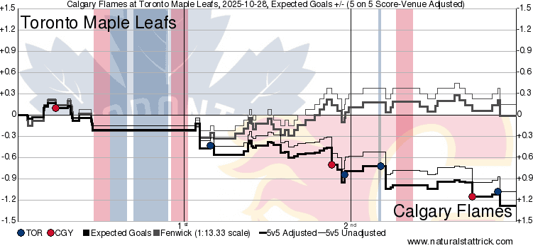 It’s a Team Game – As a team the Flames should really want that one back. Chance advantages in each frame, goals from sources that have been quiet all season (despite really strong play – looking at you Farabee and Honzek), and a 5v5 structure that was really working. Individual mistakes made in really bad spots led to this loss. Defensive zone turnovers, misplayed coverages, and bad clear attempts all ended up giving the Leafs uncontested looks directly in front of Dustin Wolf. They were able to make Calgary pay dearly for those and as such Calgary lost the game in regulation. Cleaning up those mental mishaps and keeping the same pace of play as the last three games should lead to some more wins, but there’s no guarantee those mistakes disappear.