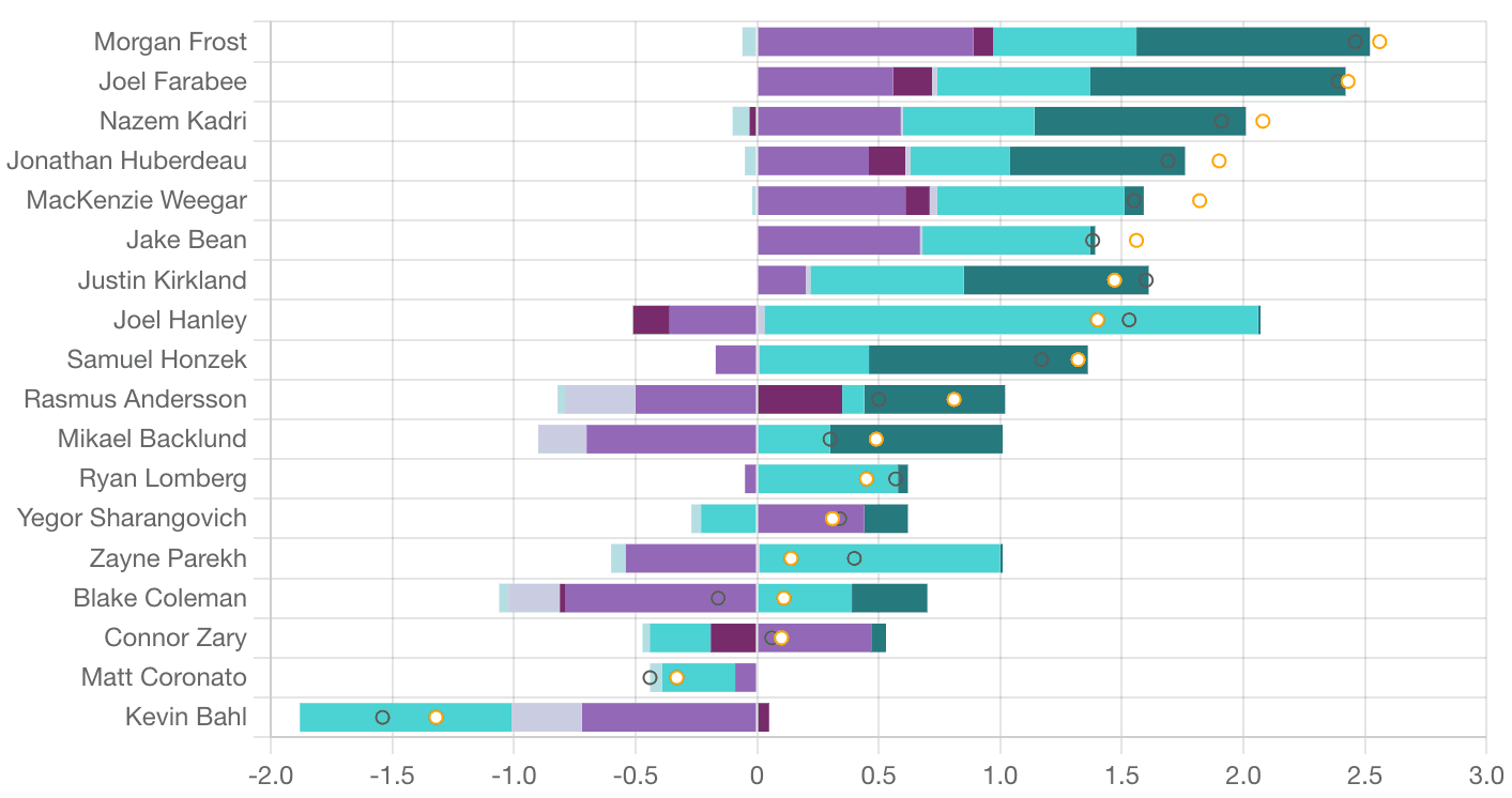 Corsi King – Morgan Frost (73.23 CF%) has found some great chemistry on the Flames top line. Not only did he score on a classic Huberdeau (62.58 per cent) rush pass for a tap-in, he was also making great little passes to Nazem Kadri (70.44 per cent) who could not buy one. Kadri was all over the ice in his old barn – really set himself apart as a noticeable force for the Flames on the attack. He’s started to let his shot rip a little more and is getting back into the game he was playing during that fire stretch last year where he was producing almost daily. Calgary needs that to continue – the turnovers should limit themselves somewhat going forward – he just has to keep focusing on driving play into the attacking zone and capitalizing.