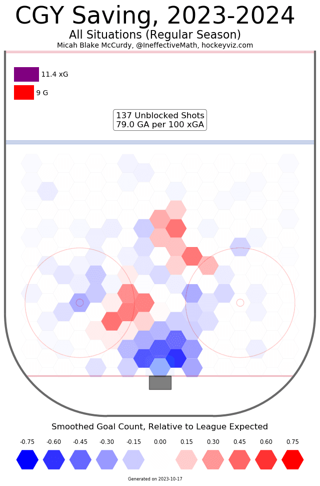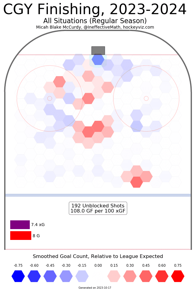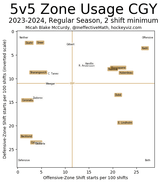 Duehr has been the most consistent Flame over the first three games, albeit in a minor role. I understand 4th liners aren’t the biggest difference in the long run, providing marginal additions to the win pool at best. Duehr though, he looks like he belongs every single shift – works his but off to get into quality areas and does what he needs to every time he’s out there. Head coach Ryan Huska has been keeping him and Greer from any offensive or defensive zone starts (see charts below for reference) making them a bit sheltered – but they are thriving in that role. Not bad for the first ever NHL player out of South Dakota.