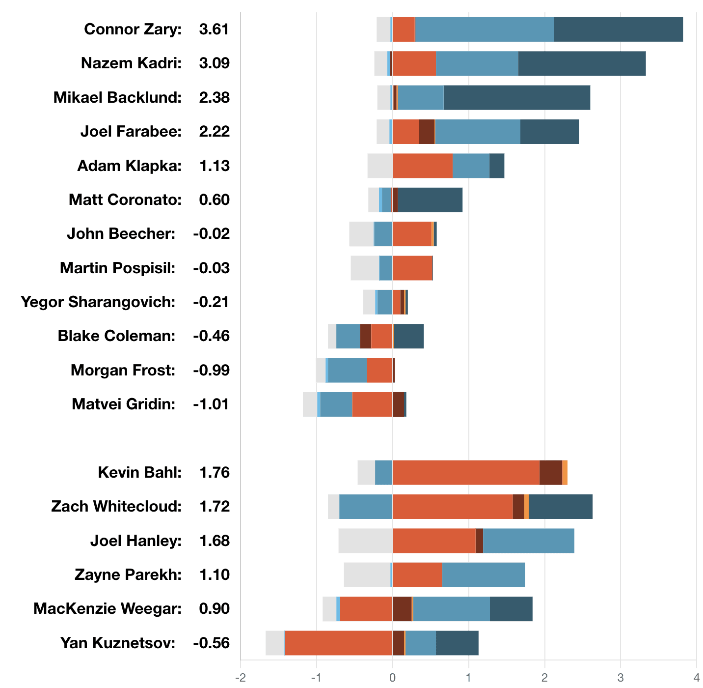 xGF% – Nazem Kadri (62.27%) with the clutch 2 goal performance coming out of the break. Just as reports surface that he wants to be traded now he has a great performance showcasing he’s still clearly got a lot left in the tank. Those weary of the age and his contract have not been watching him play close enough – he’s still the best forward the Flames have on their team. It should not be a light offer simply because he’s 35. This is a top 6, scoring centre with the reputation of not just being a winner, but being a champion. He and Blake Coleman (42.02 per cent) should fetch better returns than average due to their winning pedigree and the likely bidding war that should accompany it. One retention spot left can muddle things, but Calgary could get creative with a third party if they wanted to up the return on either (or both).