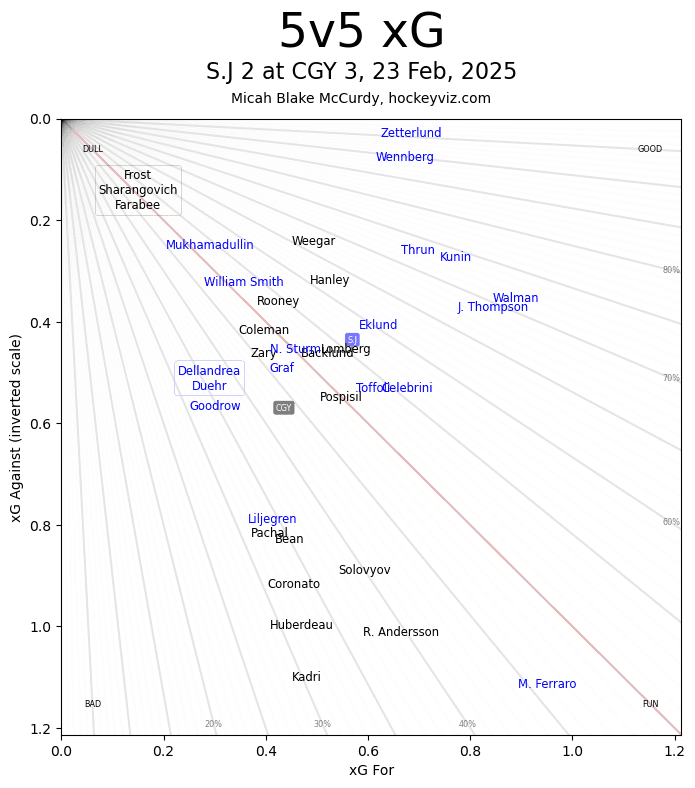 Corsi King – It was not a well-paced game for Calgary – the seemed to lose momentum as the game got later. Their 1-2-2 trap in the neutral zone would work if the Flames had the speed and puck skill to capitalize on turnovers in transition, but that just has not been there all season. Jake Bean (60.37 CF%) and Brayden Pachal (58.62 per cent) ended up the top of the shot attempt leaderboard. Nobody was able to have a large positive disparity in this game, which is not what I would have expected going in. I thought chemistry was off for every line except for Sharangovich (55.51 per cent) and the new guys from Philadelphia.
