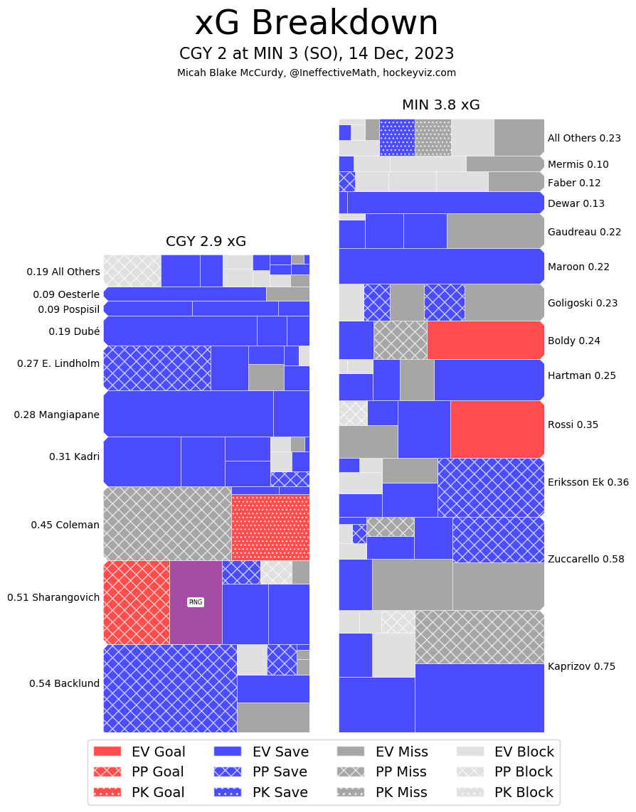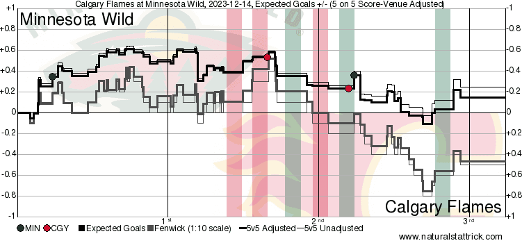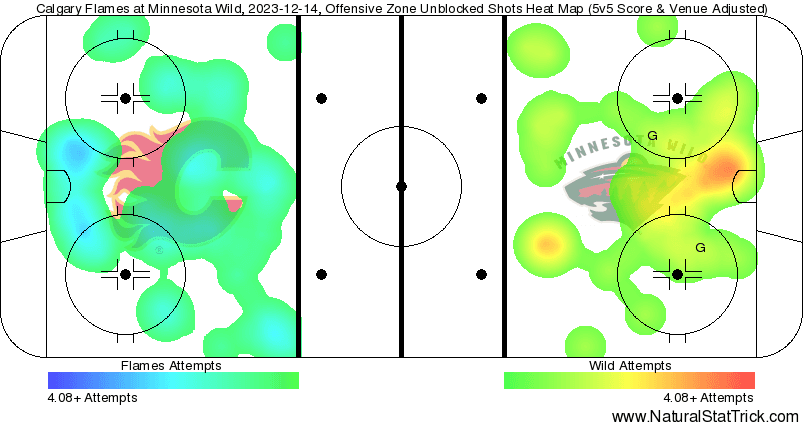 Corsi Clown – Blake Coleman (33.15%) was dinged the most on the number of shot attempts against. Later we’ll see that most of them were high quality too. The Wild really did find space in front of the net for the first half of the game and it seems the “third” line is the one that suffered the most. Jonathan Huberdeau (37.45%) is probably going to be the one discussed the most in the off time between games after his turnover led to the first goal of the game.