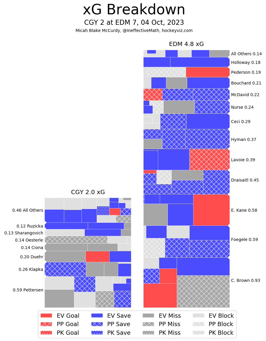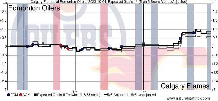 Corsi King – Yegor Sharangovich (75.98%) finishing in a spot/way you would expect of a veteran in this lineup. Adam Ružička (68.36%) was the other guy that stood above the crowd. These two handily won their minutes by getting the vast majority of the offensive opportunities. This game shows me a few things that are going to be new this year. Number one being that no matter the score the Flames will be able to generate offence, with number 2 being they need their goaltending to be up to par. With a more NHL heavy lineup you hope this is a more close game, but we all know by now if McDavid decides he’s going to score it doesn’t matter much who is on the ice does it.